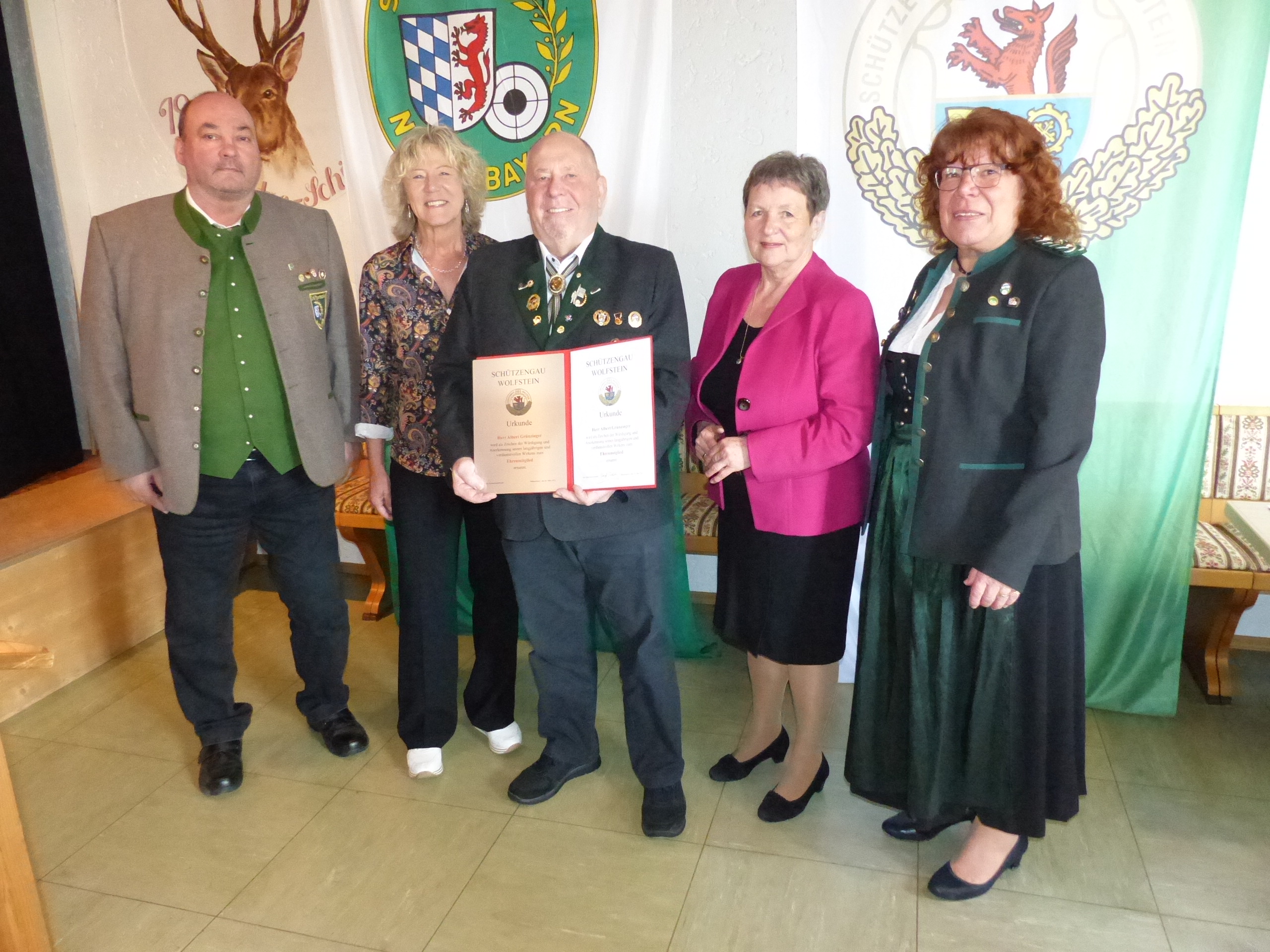 Mit stürmischem Applaus unterstützten die Anwesenden den Vorschlag des Gauschützenmeisteramtes und des Ehrungsausschusses, Albert Grünzinger zum Gauehrenmitglied zu ernennen. Zuvor hatte Gauschützenmeisterin Margit Poxleitner ausführlich die großen Verdienste um das Schützenwesen im Gau Wolfstein gewürdigt: 1975 Eintritt in die Feuerschützengesellschaft Freyung (später auch in den Schützenverein Wildschütz Speltenbach und in die SG Hubertus Böhmzwiesel), Absolvieren zahlreicher Lehrgänge (u.a.: Ausbildungsleiter für Waffensachkunde, Trainer C, Vorstufenausbildung für Übungsleiter, Erwerb der Kampfrichterlizenz), dazu viele Jahre lang Mitglied der Fahnenabordnung im Schützenbezirk Niederbayern und aktuell noch Mitglied im Sportbeirat des Landkreises Freyung-Grafenau. Im Gau Wolfstein war Albert Grünzinger unter anderem tätig als Referent für Aus- und Weiterbildung und für Feuerwaffen, als stellvertretender Gausportleiter, stellvertretender Gauschützenmeister und 1. Gauschützenmeister. Entsprechend groß ist die Zahl von Auszeichnungen, mit denen das überaus starke Engagement von Albert Grünzinger im Lauf der Jahre gewürdigt wurde.