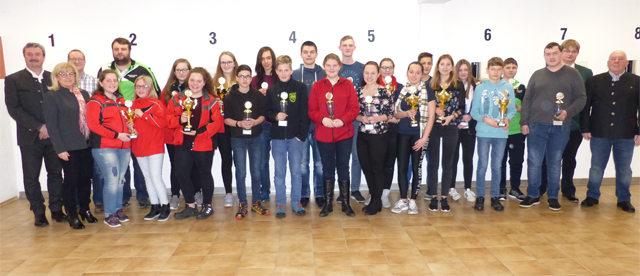 Zur Teilnehmerzahl bei den Jugendfernwettkämpfen merkte der Gaujugendleiter an, dass man mit 82 Startern um zwei höher als vor einem Jahr liege. Aufgeschlüsselt nach Waffengattungen schossen 37 Jugendliche mit dem Luftgewehr, 16 mit Lichtgewehr, 1 mit Luftpistole, 28 mit Bogen.